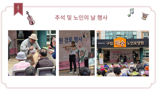 구립해송노인요양원은 중구 문화재단 공모에 선정되어 9월 30일(화) 추석 및 노인의 날 기념 행사를 진행했습니다. 이번 행사에는 요양원 어르신뿐만 아니라 인근 경로당 어르신들까지 초청하여 지역축제로서 함께 즐기는 뜻깊은 시간을 마련하였습니다.
