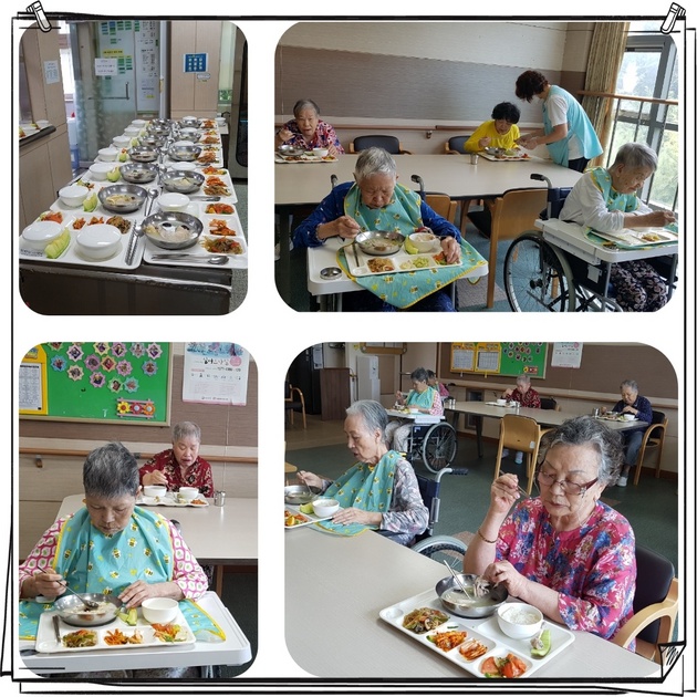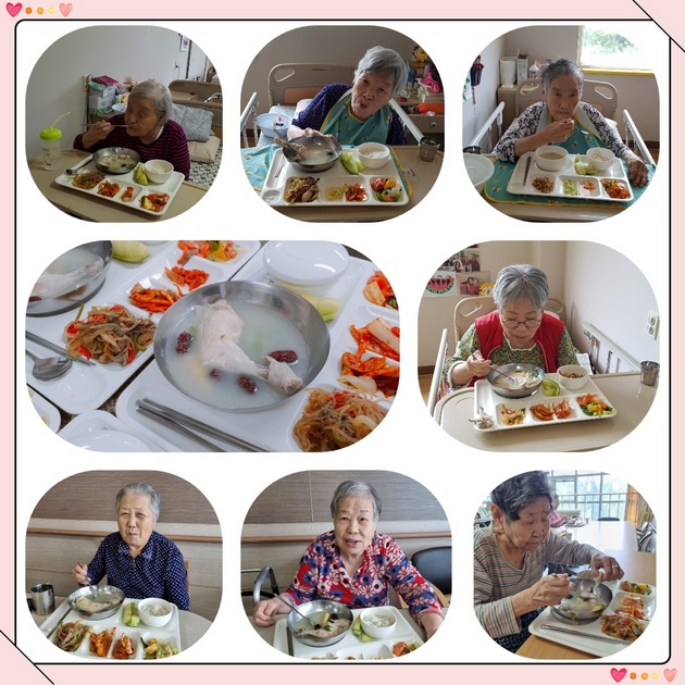 금일 중복을 맞이하여 흰찹쌀밥, 장각삼계탕, 느타리버섯잡채, 훈제연어샐러드&머스크멜론을 제공하여 더운여름 어르신들 모두 건강하게 보내시기를 응원하는 시간이었다.