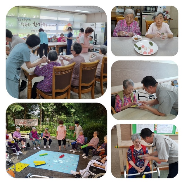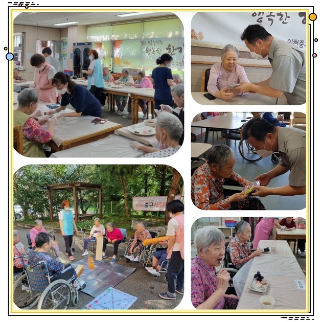 추석명절행사로 어르신들께서 송편을 예쁘게 만드신 후 쪄서 맛있게 드시고 산책로에서 대형 윳놀이를 던지시며 즐거운 시간을 보내심. 어르신들에게 필요한 물품을 포장하여 원장님께서 선물을 전달해 드리며 행복한 추석명절이 되시도록 격려해드림