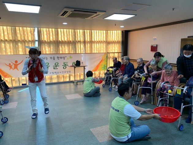 코스모스 피는 가을을 맞이하여 어르신들의 신체적 활력 및 건강한 노후를 맞이하여 대한항공 하늘사랑회 자원봉사팀과 연계하여 가을운동회를 진행하였습니다.