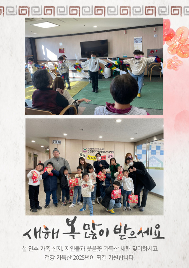 아이들이 감사하는 마음을 담아 세배를 하고 어르신들께서 덕담을 나누는 정겨운 행사였습니다. 어르신들께 기쁨을 전달하기 위해 아이들은 춤과 정성들인 편지를 낭독하고 나눠드리며 따뜻한 시간을 갖고 명절의 전통 놀이인 윷놀이를 하며 즐거운 설날행사를 맞았습니다.