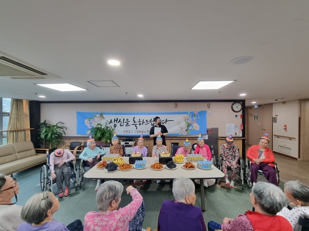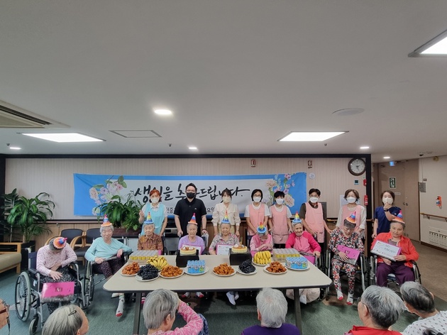 생신을 맞이하신 어르신들과 함께 생신잔치를 하고