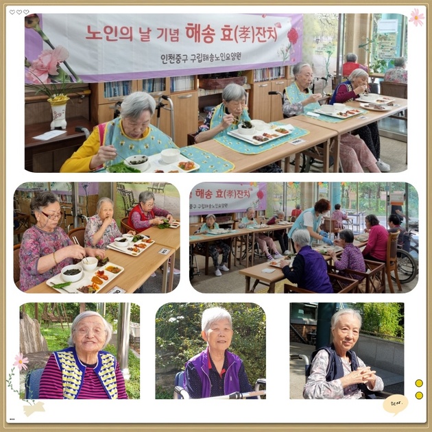 노인에 대한 공경과 감사한 마음을 새기기 위해 제정한 기념일인 노인의 날을 맞이하여 어르신들에게 인천중구 자원봉사센터에서 후원한 "한복방향제" 선물전달과 "특식제공"(와규꽃살즉석로스구이)으로 어르신들을 대접해 드리며 웃음가득한 행복한 시간이 되었다.