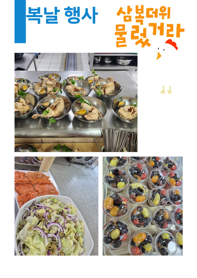 이어지는 점심식사 시간에는 정성껏 준비한 삼계탕 특식을 제공하여 지친 기력을 보충하고 어르신들의 입맛과 건강을 챙겨드렸습니다.
