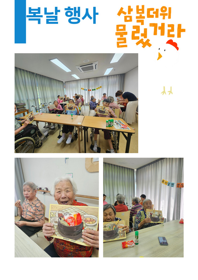 무더위 속에서도 웃음과 따뜻함이 가득했던 이번 복날 행사 앞으로도 구립해송요양원은 어르신들의 계절별 건강과 즐거움을 위한 다양한 프로그램을 함께 하겠습니다.
