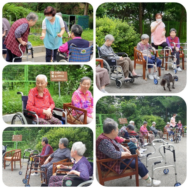 일반식을 드시는 어르신들께 여름철 분위기를 낼 수 있도록 부드러운 옥수수와 수박 등의 간식을 준비하여 드린 후 가볍게 산책하는 시간을 가졌습니다.