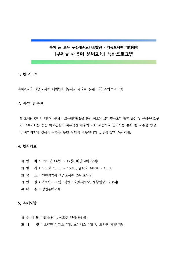 | 제목 | 복지&교육 구립해송노인요양원, 영종도서관 대외협력 [우리글 배움터 문해교육] 특화프로그램 |