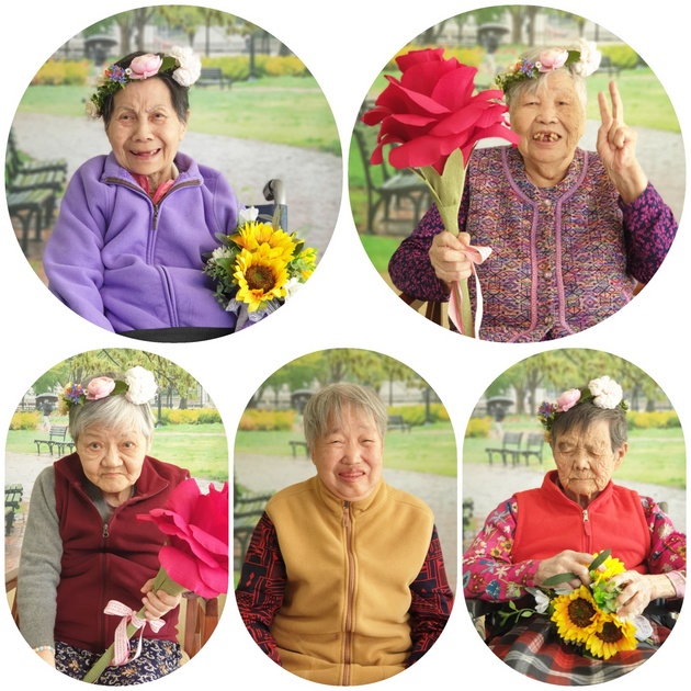 1층 현관에 포토존을 설치한 후 다양한 소품을 이용하여 사진을 찍어드리고 있어요. 이쁘게 꾸며드리니 너무 좋아하셨어요~^^