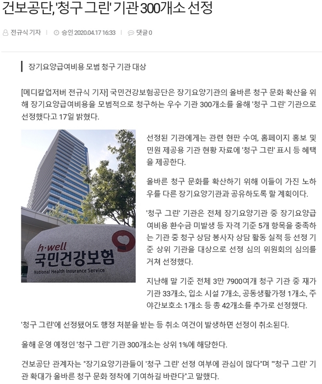 건강보험공단에서 장기요양급여비용 모범 청구 기관을 대상으로 [청구그린기관]을 선정하였습니다.